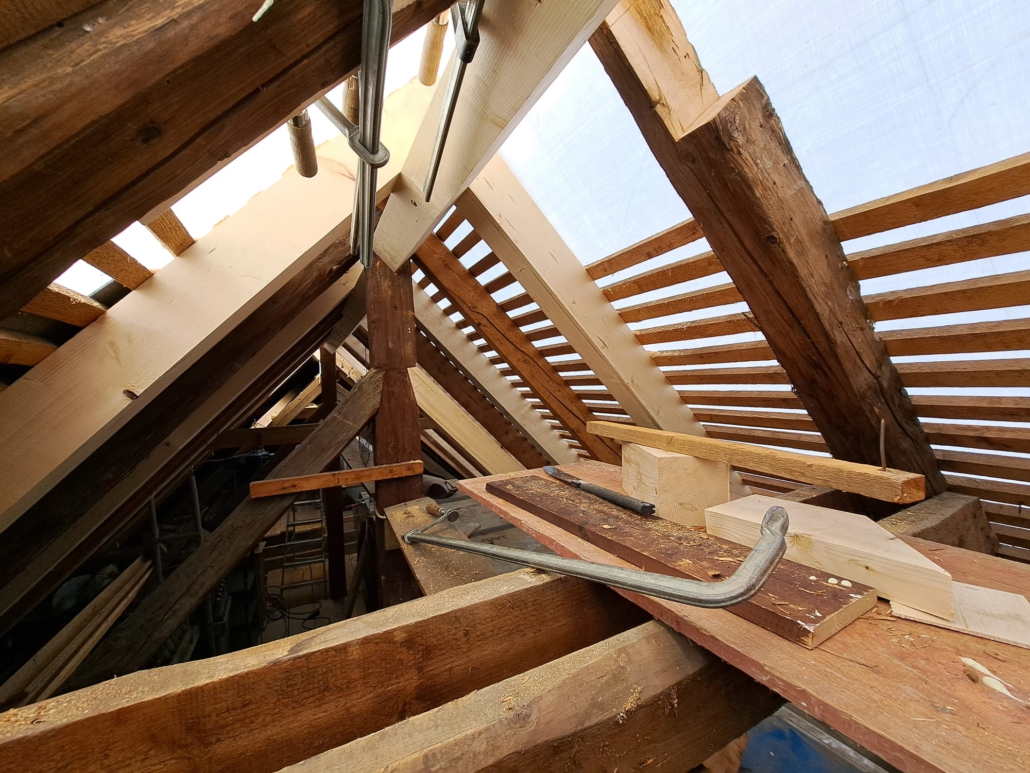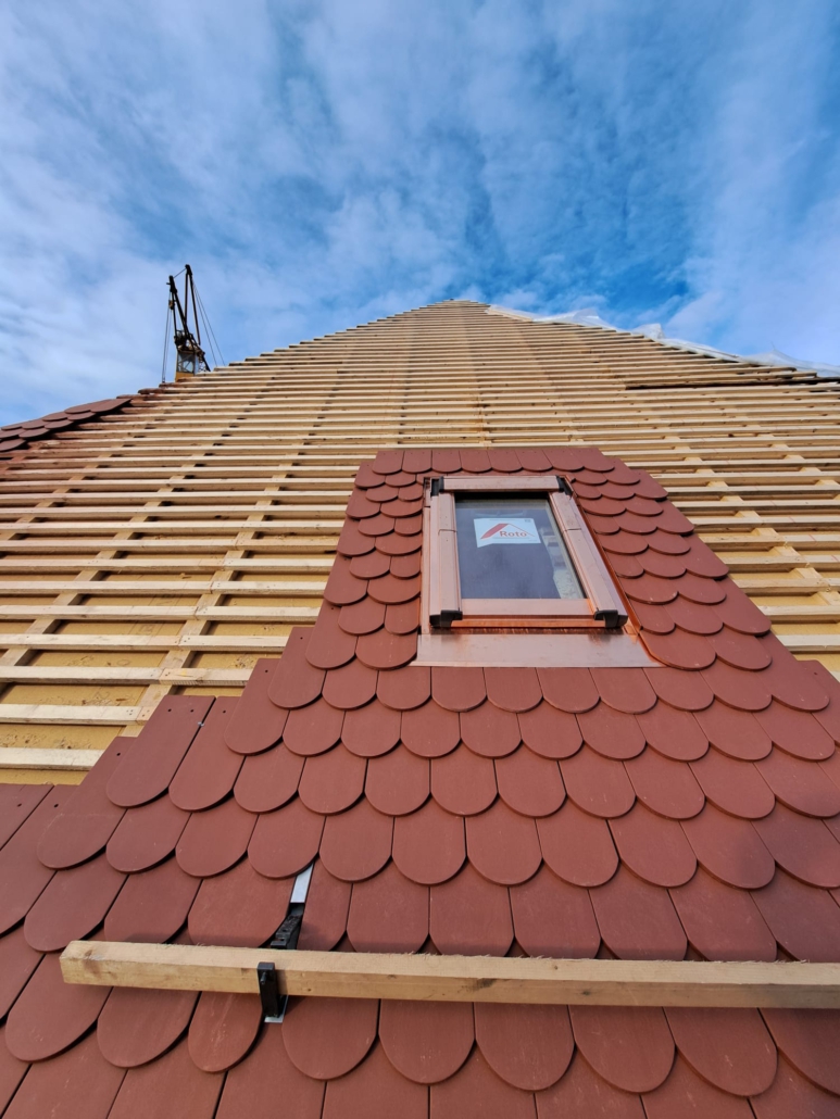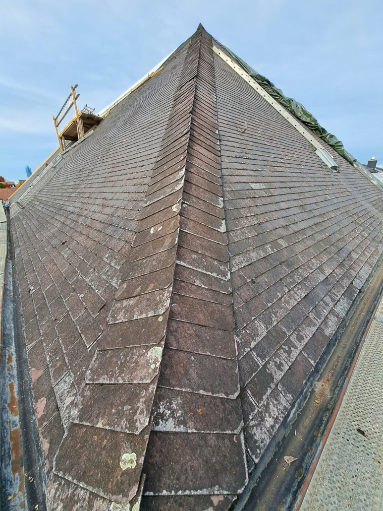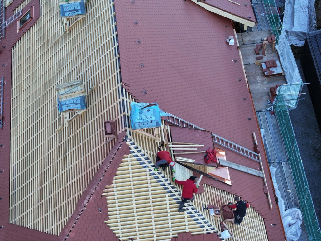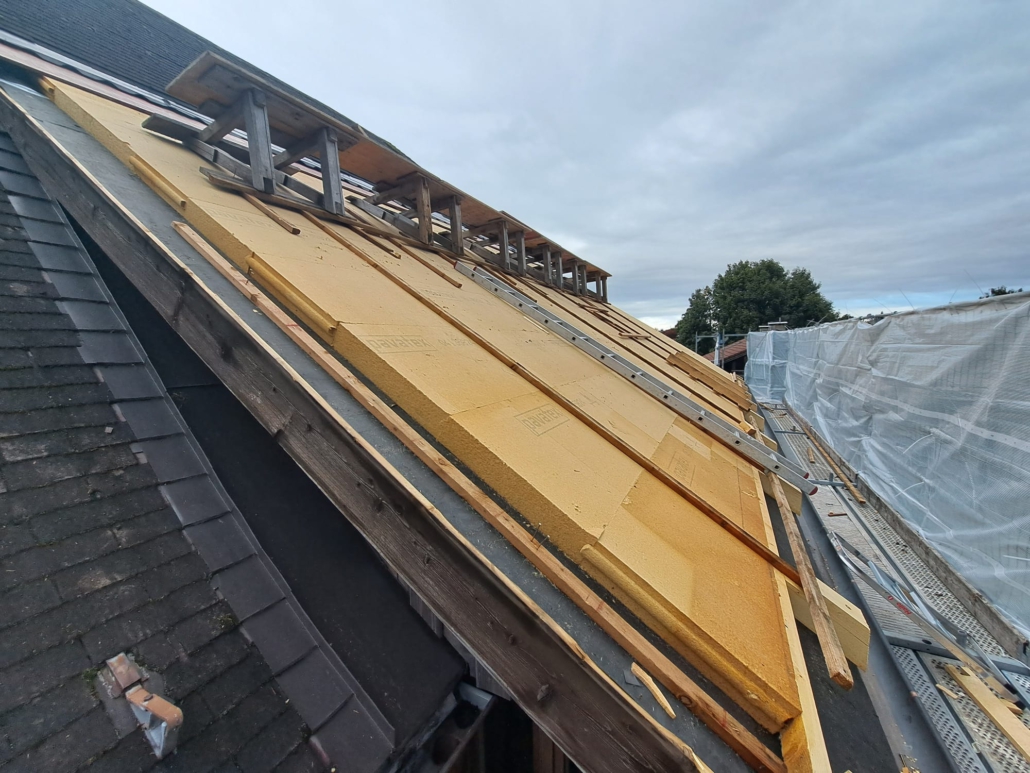 Nach Freigabe durch das Denkmal- und Bauamt wurde der Dachstuhl bereits mit großem handwerklichem Geschick von innen statisch ertüchtigt. Die alte Eindeckung wurde durch eine Fachfirma entfernt und fachgerecht entsorgt. Im nächsten Schritt wurde dann von außen die Aufdachdämmung aus Holzfaser aufgebracht, gefolgt von der fachgerechten Eindeckung mit Biberschwanzziegeln.