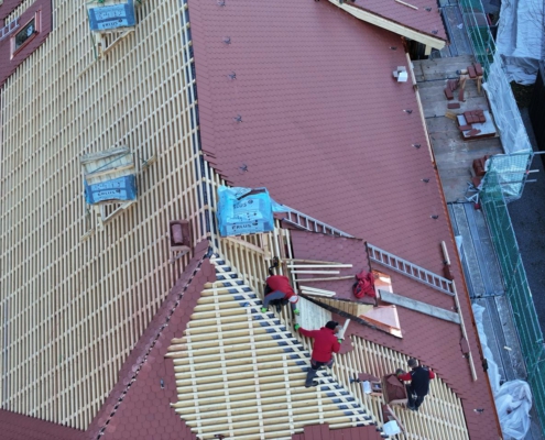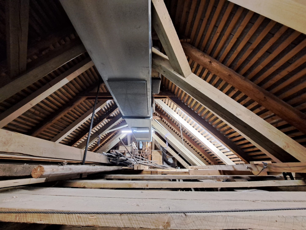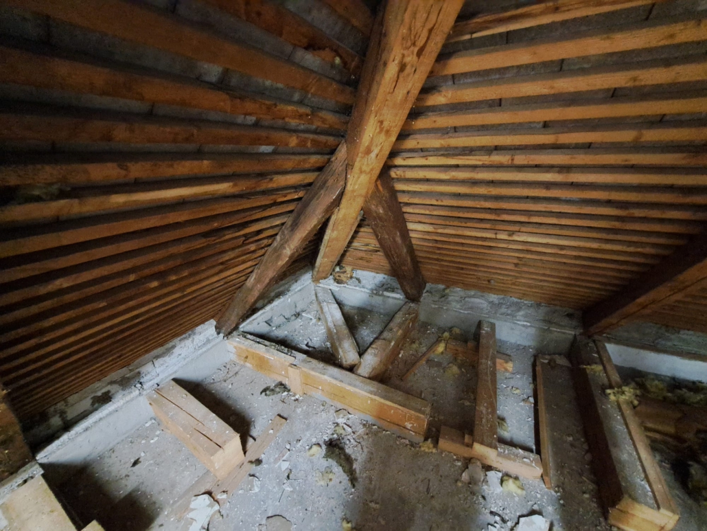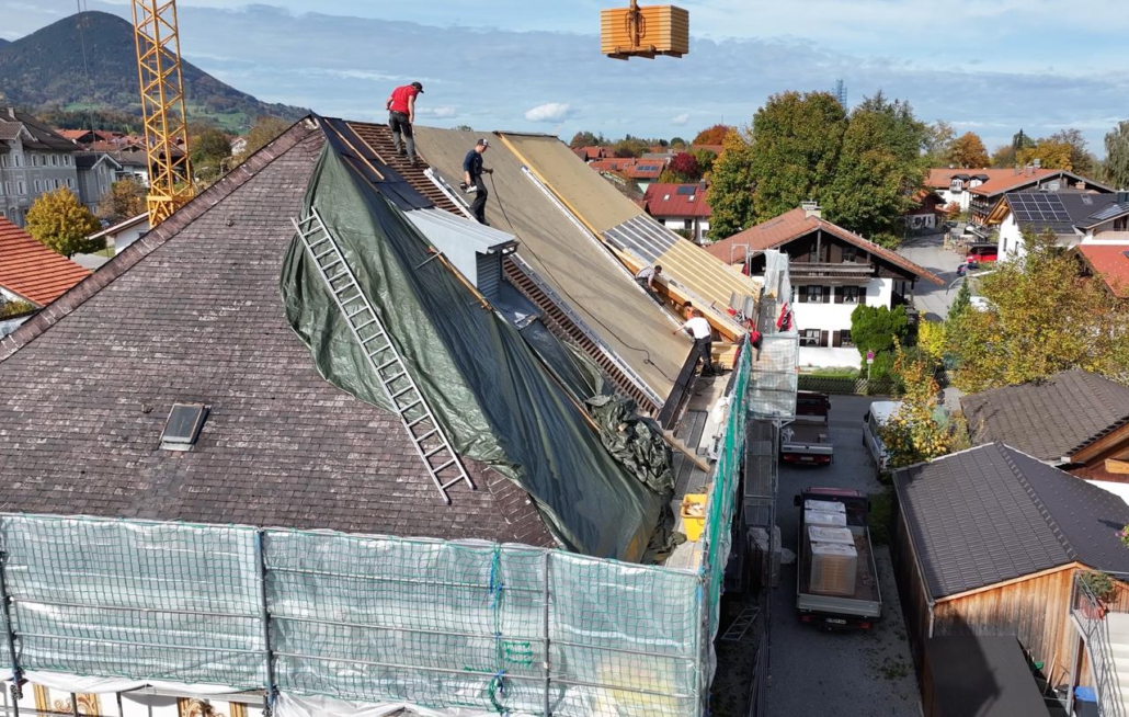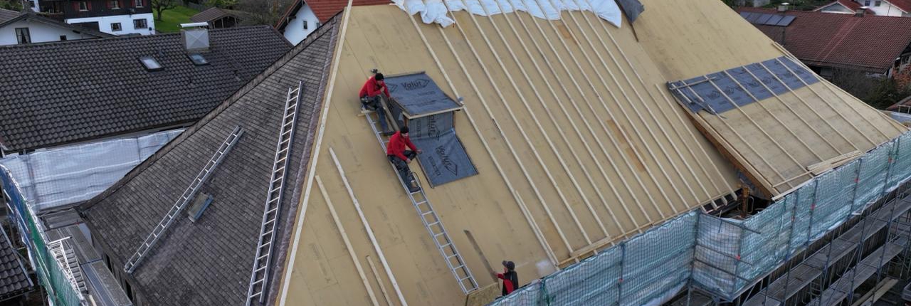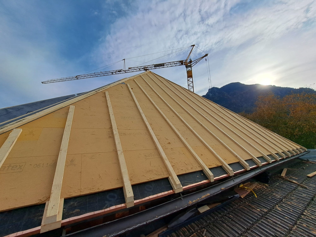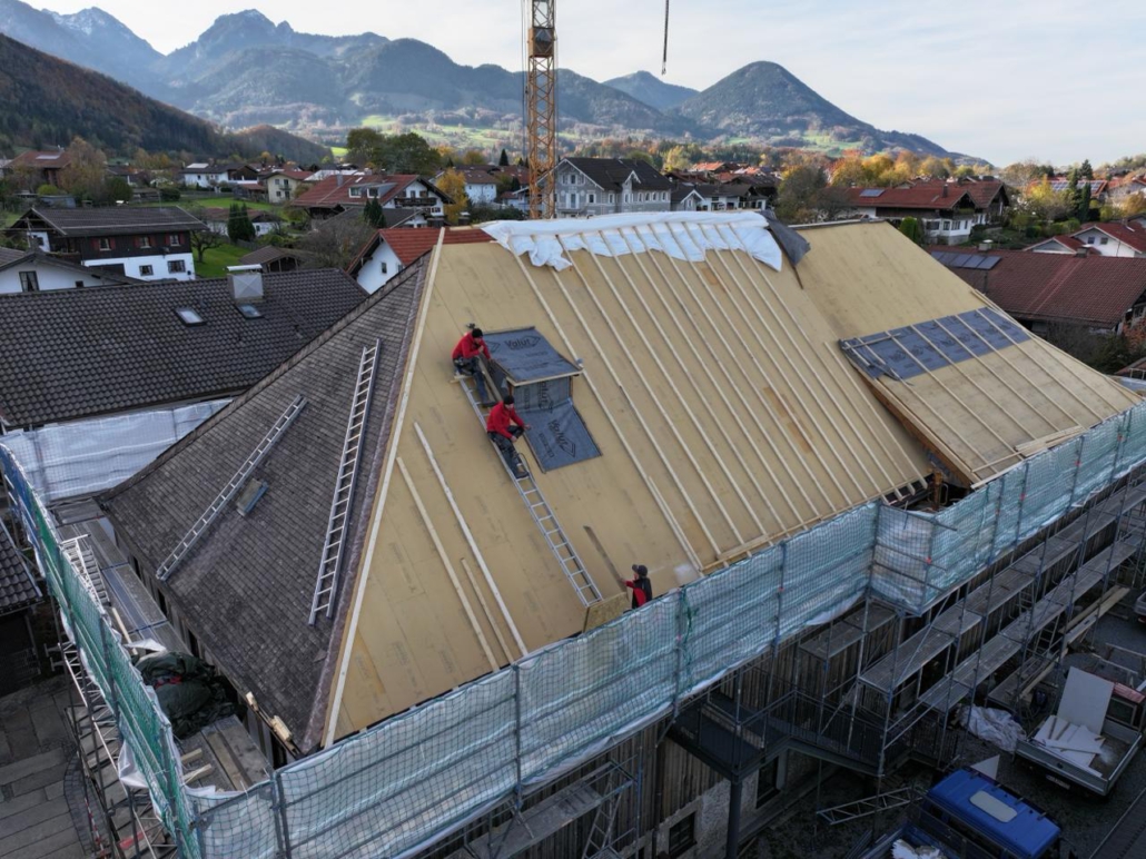 Nach Freigabe durch das Denkmal- und Bauamt wurde der Dachstuhl bereits mit großem handwerklichem Geschick von innen statisch ertüchtigt. Die alte Eindeckung wurde durch eine Fachfirma entfernt und fachgerecht entsorgt. Im nächsten Schritt wurde dann von außen die Aufdachdämmung aus Holzfaser aufgebracht, gefolgt von der fachgerechten Eindeckung mit Biberschwanzziegeln.